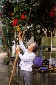作法:如图示(图中以一手按对侧头顶)(反之亦然)以手按头顶不同部位,用力向对侧扳,一次约扳十秒钟(扳住:念十声佛)。扳不同的部位、方向,可拉开不同之肌肉。
