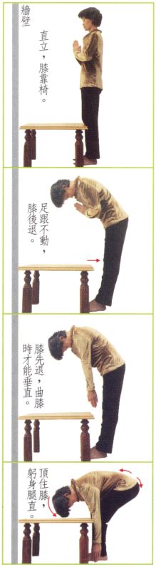 [1]由前方顶住(用一椅靠墙,如图,在前面顶住膝)(脚跟不动)稍熟悉这感觉。初学者练习时也可用下垂的‘手肘’,顶住膝使不向前斜,手也垂直,小腿也垂直。(如图)