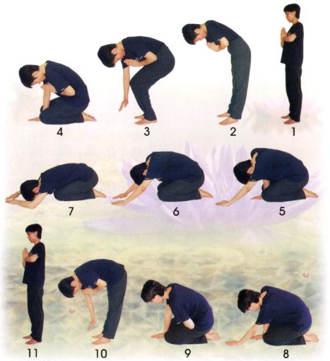 双手按地、下跪,表谦恭到底,慈悲到底。(另有‘先右后左’法,见后面说明)